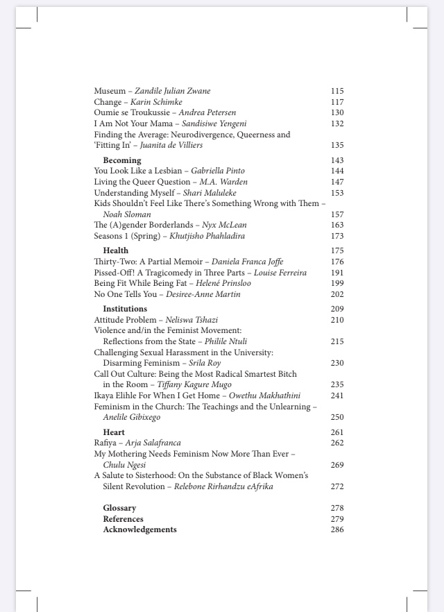 This collection follows the Feminism Is collection, but instead of reaching out to already famous feminist voices, I pitched it as an open submission collection. I received more than 200 000 words in submissions and with the help of the Kwela team we made the final selection. The collection features 50 new pieces of writing including essays, poetry and memoir. I mean — take a look at this contents list!