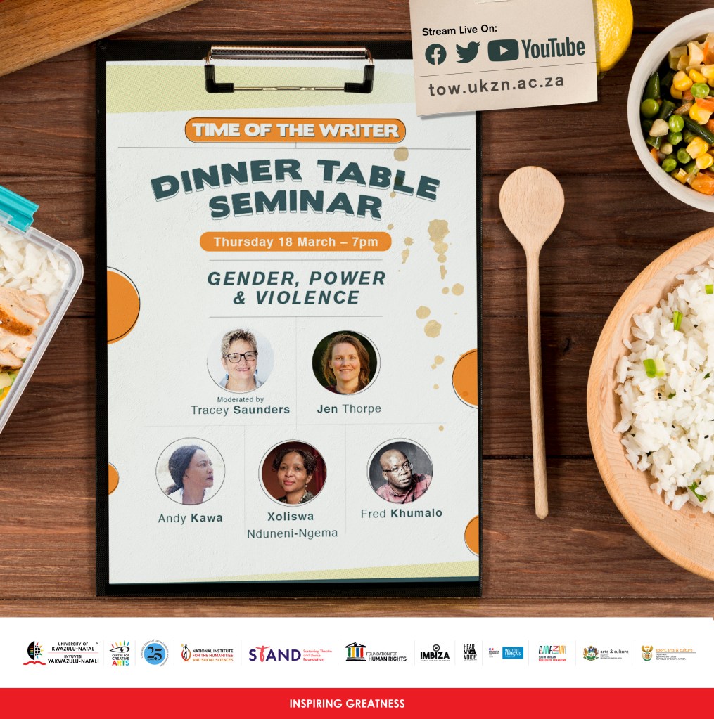 This Thursday evening at 7pm I’ll be part of a ‘dinner table’ session moderated by Tracey Saunders featuring Andy Kawa, Xoliswa Nduneni-Ngema, and Fred Khumalo. We’ll be talking about gender, power and violence. Register to attend here.