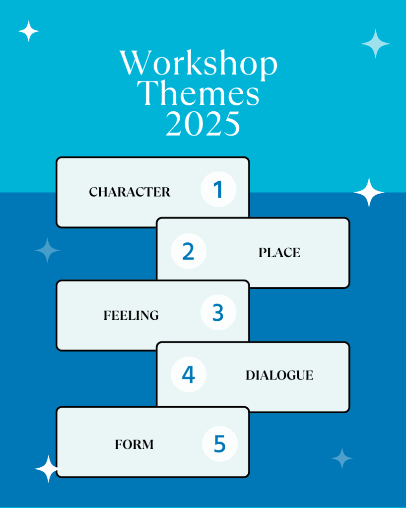 In every workshop we will sit down and complete a series of writing exercises. These will be structured around a theme (see the image below). The theme is there to guide me in sharing activities, prompts, quotes and insights that I will share. The writing you do, however, is totally up to you.
