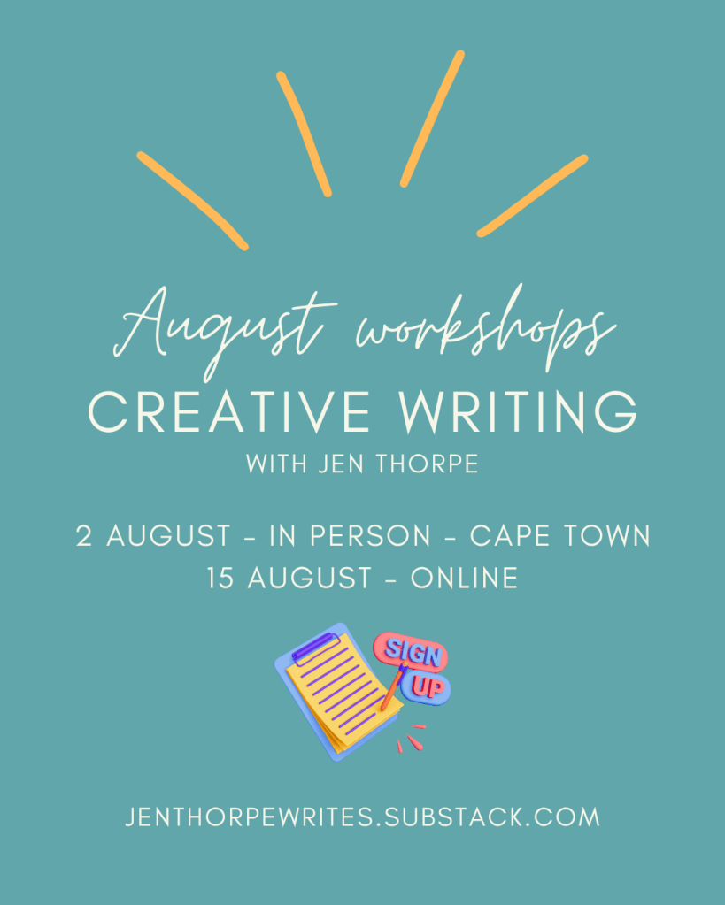 - 2 August – come and write creatively with me at Erin Hall in Rondebosch, Cape Town. The workshop takes place from 11am until 3pm.