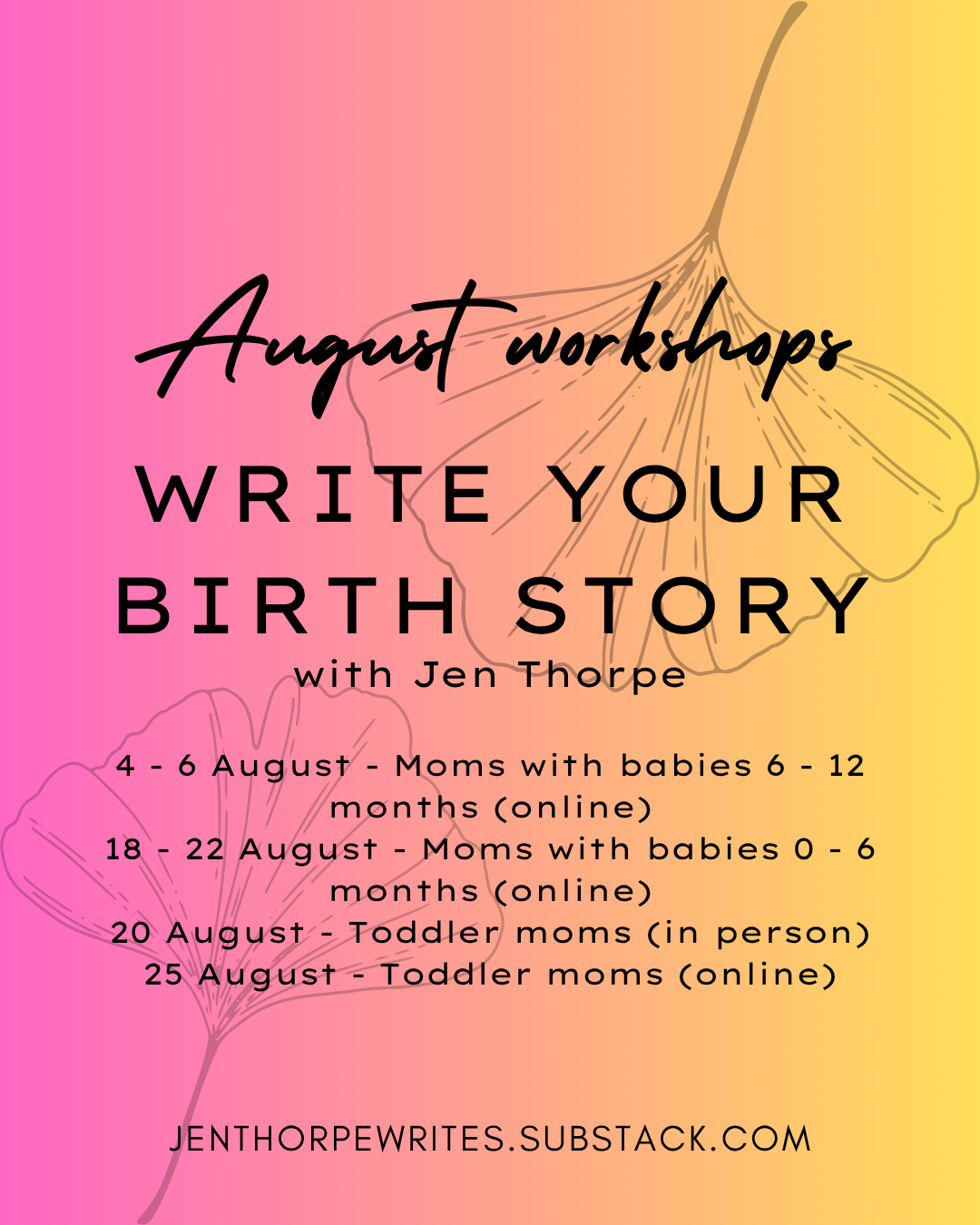 I’m running four birth writing workshops in August. These workshops are an opportunity to spend time reflecting on and writing down your birth experience. There are three online and one in-person workshop. Dates as follows: